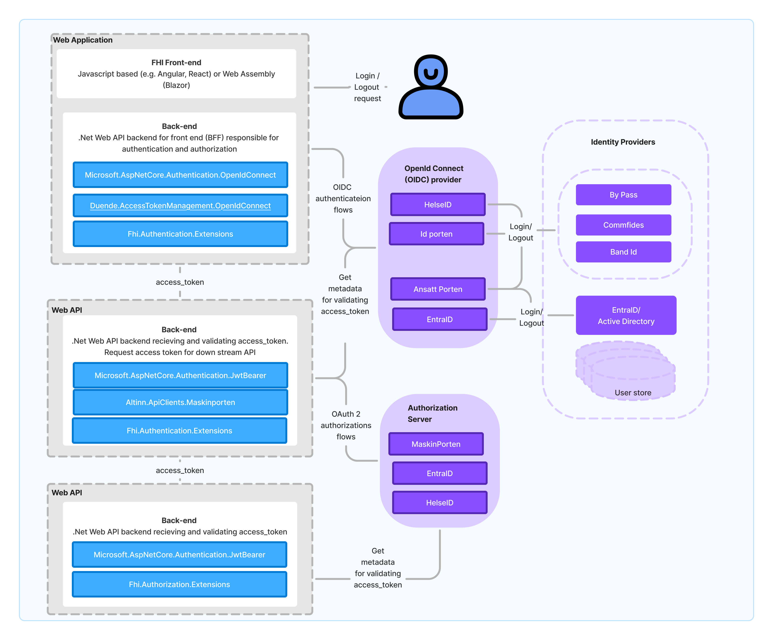 The Fhi.AuthExtensions contains nuget packages, tutorials, guidelines and code samples of how to do authentication and authorization in FHI. The code and samples is built on top of Duende open source project and Microsoft authentication libraries